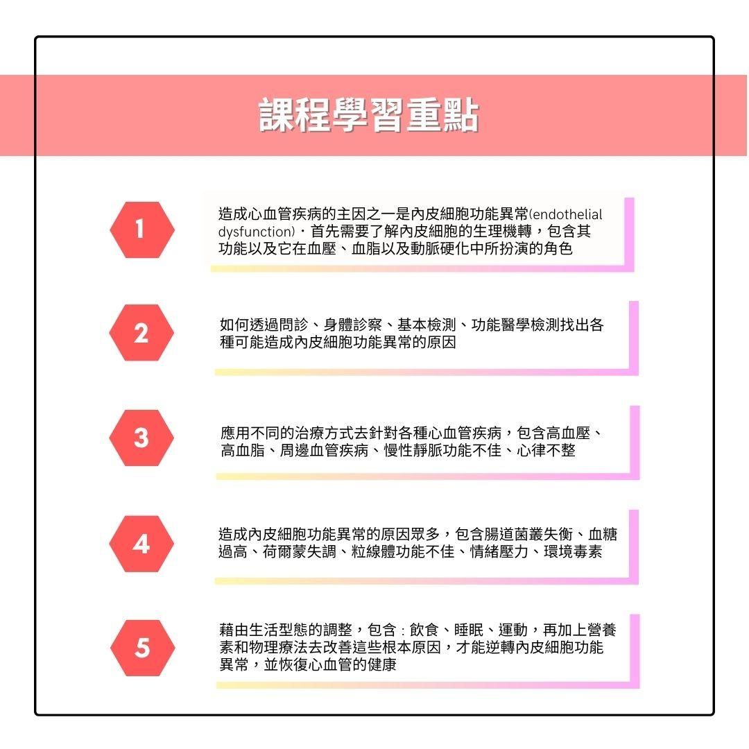 藉由生活型態的調整,包含 : 飲食、睡眠、運動,再加上營養素和物理療法去改善這些根本原因,才能逆轉內皮細胞功能異常,並恢復心血管的健康