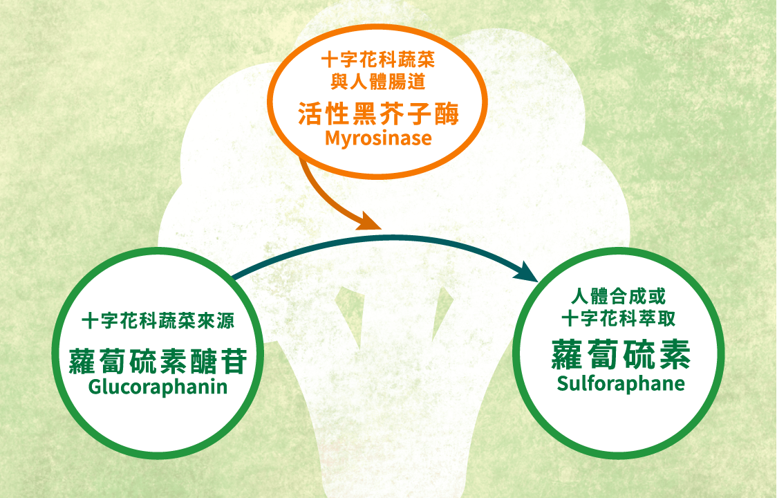蘿蔔硫素醣苷Glucoraphanin、活性黑芥子酶Myrosinase、蘿蔔硫素Sulforaphane